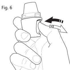 5. Ta hull på kapselen Hold Vertical-Haler med munnstykket pekende oppover. Trykk bestemt knappen helt ned én gang til den er helt gjemt (Fig. 6). Slipp knappen opp igjen. Dette vil ta hull på kapselen, slik at du kan inhalere legemidlet når du puster inn. OBS: Dersom du behøver å gjenta trinn 5, åpne kapselkammeret (Fig. 2) for å forsikre deg om at kapselen er satt inn riktig (Fig. 4). |