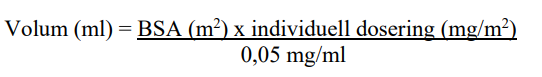 Den rekonstituerte oppløsningen skal fortynnes med natriumklorid 9 mg/ml (0,9 %) infusjonsvæske, oppløsning eller glukose 50 mg/ml (5 %) infusjonsvæske, oppløsning. Riktig volum regnes ut på følgende måte: