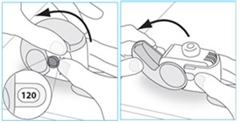 Utfør tre trinn for å ta en dose fra inhalatoren: Åpne, inhaler, lukk.