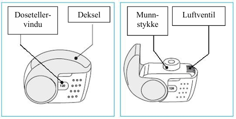 Det kommer i en hvit plastinhalator som kalles NEXThaler, med et grått munnstykkedeksel og en teller for antall inhalasjoner.