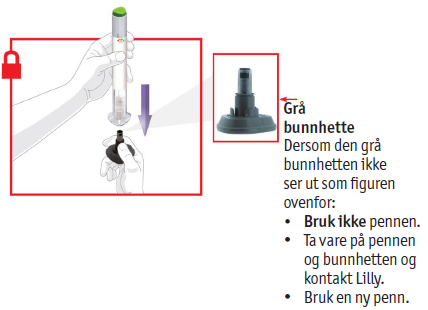 Ikke fjern bunnhetten og ikke bruk pennen. Kast pennen som anvist av lege, apotek eller sykepleier. Injisér dosen din med en annen penn.