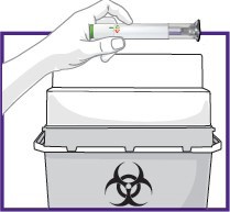 Kast pennen i en beholder som kan lukkes og der kanylen ikke kan stikke igjennom, eller slik lege, apotek eller sykepleier har anvist.