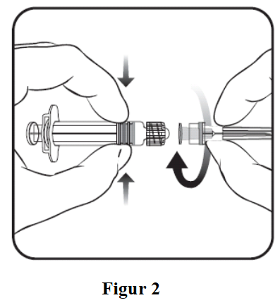 For å feste kanylen til sprøyten, les nøye instruksjoner som er gitt under i figur 1 og 2. Sprøyten som følger med Varilrix kan være noe ulik (uten skrugjenger) sprøyten som er avbildet. I så tilfellet skal kanylen festes uten å skru.