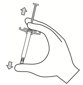 6. Hold sprøyten med den påfestede kanylen med kanylen opp for å slippe ut luft. Slipp ut luft fra sprøyten ved å trykke stempelstangen forsiktig oppover.