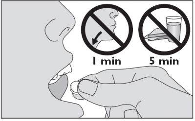 5. Legg legemidlet under tungen. La det ligge der til det har gått i oppløsning. Ikke svelg før det har gått 1 minutt. Ikke spis eller drikk på minst 5 minutter.