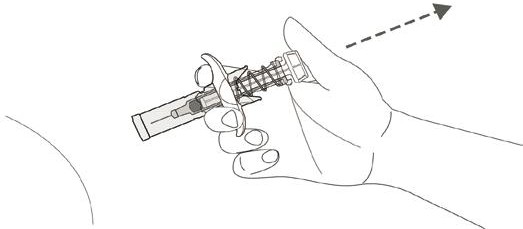Nålebeskyttelsen dekker nålen etter injeksjonen for å forhindre nålestikkskade. Dette påvirker ikke normal bruk av sprøyten. Trykk ned stempelstangen og trykk bestemt på slutten av injeksjonen for å forsikre at sprøyten tømmes helt. Hold godt fast i huden til injeksjonen er fullført. Hold sprøyten i ro og løft tommelen langsomt fra stempelstanghodet. Stempelstangen flyttes opp med tommelen, og fjæren trekker nålen ut fra stedet og inn i nålebeskyttelsen.