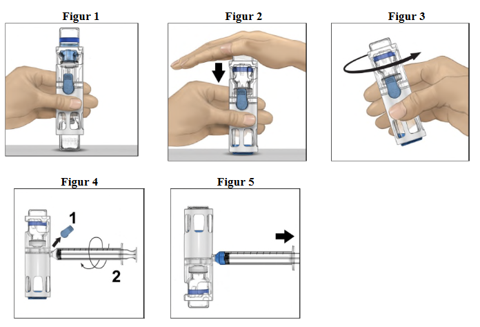 Kontroller at all oppløsningsvæsken er overført. Virvle forsiktig til alt materialet er oppløst (figur 3). Sørg for at pulveret løser seg helt opp, ellers vil ikke hele den rekonstituerte oppløsningen passere gjennom filteret i enheten. Legemidlet løser seg opp raskt (vanligvis på under 1 minutt). Etter rekonstituering skal oppløsningen være klar, fargeløs og uten fremmedpartikler.