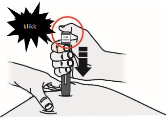 Merk: Du må presse helt ned, men ikke berør startknappen før du er klar til å injisere.