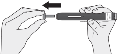 Når du er klar til å injisere, trekk hetten rett av. Injeksjonen må administreres innen 5 minutter. Det er normalt å se en væskedråpe i enden av kanylen eller sikkerhetsdekslet.