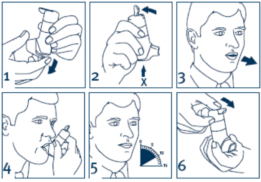 Ta munnstykket i munnen, og lukk leppene rundt. Pust rolig inn. Ikke stopp når du hører et klikk og kjenner sprayen i munnen, men fortsett til lungene er fylt.