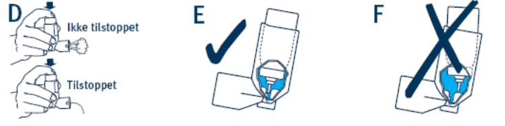Hvis sprayen er tilstoppet av legemiddelrester, eller det kun kommer litt eller ikke noe legemiddel når du trykker på metallbeholderen (se bilde D), kan dette skyldes: