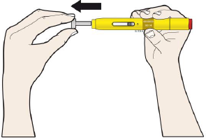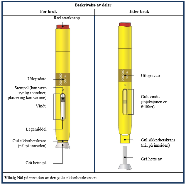 Ikke fjern den grå hetten fra den ferdigfylte pennen før du er klar til å injisere.Kontakt helsepersonell umiddelbart hvis du ikke klarer å injisere selv.