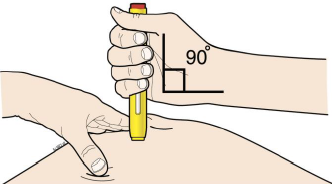 G. Fortsett å holde huden strekt eller klemt. Ta av hetten og trykk den ferdigfylte pennen ned mot huden i 90 graders vinkel.