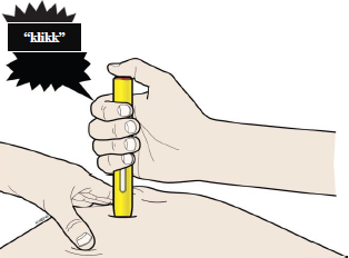 J. Fortsett å trykke den ferdigfylte pennen ned på huden. Injeksjonen tar cirka 15 sekunder.