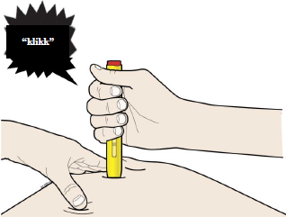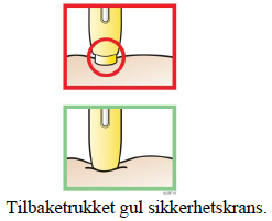Viktig: Du må trykke den ferdigfylte pennen helt ned, men ikke rør den røde startknappen før du er klar til å injisere.