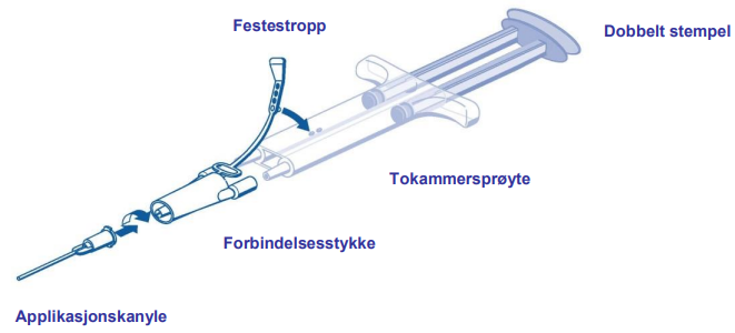 Før påføring kobles den bruksklare sprøyten med to kamre med tetningsproteinoppløsningen og trombinoppløsningen til et forbindelsesstykke og en applikasjonskanyle - begge finnes i settet med påføringsutstyr. Det felles stempelet til den bruksklare sprøyten med to kamre sikrer at like volumer av de to vevslimkomponentene føres gjennom forbindelsesstykket og inn i applikasjonskanylen, der de blandes og deretter påføres.