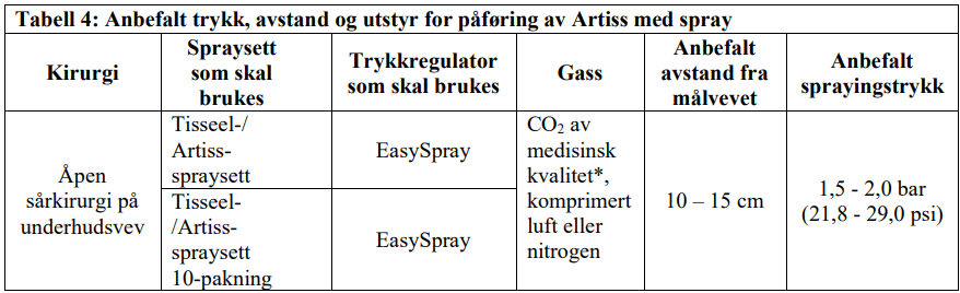 Ved påføring av Artiss med sprayutstyr må du sørge for å bruke et trykk og en avstand fra vev som er innenfor områdene som anbefales av leverandøren som følger: