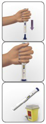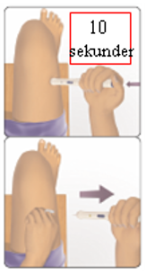 1. Rengjør injeksjonsstedet Hvis det er nødvendig kan du bruke en desinfeksjonsserviett til å rengjøre huden på injeksjonsstedet. La huden tørke. Tips: Det beste stedet er øverst på yttersiden av låret. |