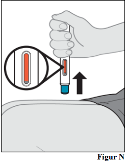 Merk: Hvis ikke den oransje indikatoren beveger på seg, kast den ferdigfylte pennen og bruk en ny.