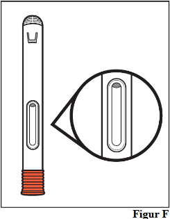 a. Hold den ferdigfylte pennen komfortabelt i den ene hånden, slik at du kan se vinduet (se figur K).