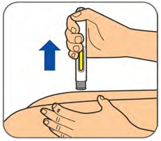 Press den ferdigfylte pennen bestemt ned mot injeksjonsstedet for å begynne injeksjonen.