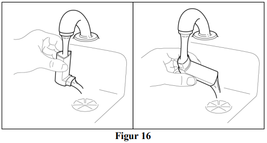 Steg 3: Hold plasthylsen under en kran og skyll den med varmt vann i omtrent 30 sekunder. Snu plasthylsen opp-ned og skyll den igjen gjennom munnstykket i omtrent 30 sekunder (se figur 16).