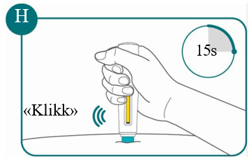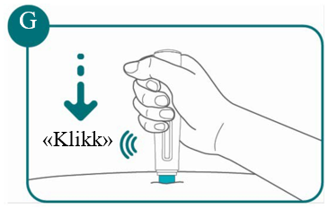 Du vil høre en klikkelyd. Injeksjonen begynner når du hører det første klikket (se figur G). Ikke løft den ferdigfylte pennen bort fra huden.