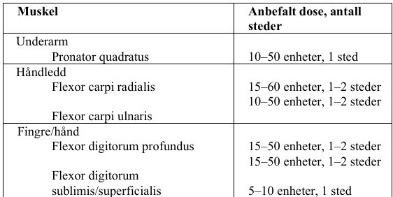 Det skal ikke gis mer enn 50 enheter på noen av administrasjonsstedene. Det skal ikke gis mer enn 100 enheter i sternokleidomastoideus. Det bør ikke injiseres mer enn 200 enheter totalt ved første behandling. Justeringer kan gjøres ved etterfølgende behandlinger avhengig av initiell respons. En total dose på 300 enheter bør ikke overskrides på noen av administrasjonsstedene. |