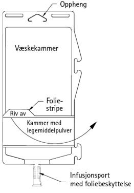 Fjern beskyttelsesfolien fra infusjonsporten og koble til det sterile administreringssettet. Heng posen på et infusjonsstativ.