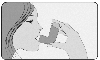 5. Rett etter at du starter å puste inn gjennom munnen, trykker du ned på toppen av inhalatoren med pekefingeren for å utløse en dose av legemidlet samtidig som du fortsatt puster sakte og dypt inn. Pass på at dosen med legemiddel ikke slipper ut på over- eller undersiden av munnen eller i munnvikene.