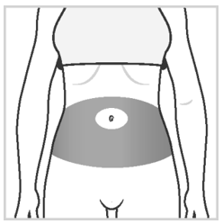 Område 1: Magen (abdomen) rundt navlen. Unngå området rundt navlen i 5 cm avstand,