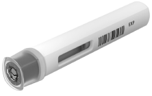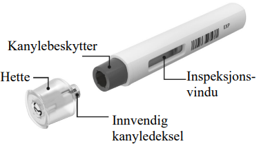 Kanylen er dekket av kanylebeskytteren og vil ikke være synlig. Ikke rør eller trykk på kanylebeskytteren fordi du kan få en stikkskade av kanylen.