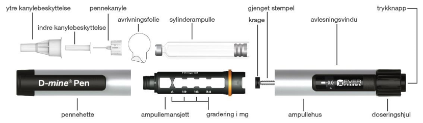 Dacepton sylinderampuller er laget til bruk kun med den tiltenkte D-mine Pen og pennekanyler til engangsbruk som spesifisert i bruksanvisningen for pennen.