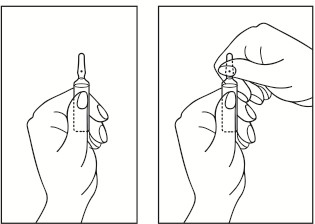 Bruk begge hendene til å åpne; hold nederste delen av ampullen med den ene hånden og bruk den andre hånden til å brekke den øverste delen av ampullen av, i retning vekk fra den fargede tuppen (se på bildene nedenfor).