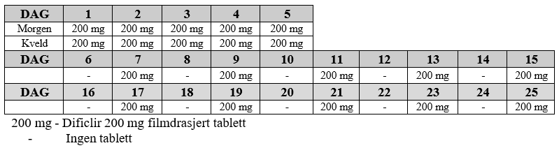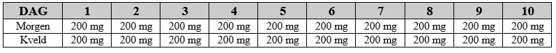 Standard dose for pasienter som veier minst 12,5 kg er én tablett (200 mg) to ganger om dagen (én tablett hver 12. time) i 10 dager (se plan 1 nedenfor).