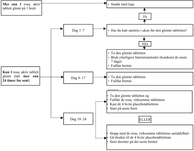 I dette pakningsvedlegget beskrives flere situasjoner der du bør slutte å ta p-pillen, eller der p-pillens pålitelighet kan være redusert. I slike situasjoner bør du ikke ha samleie, eller du bør ta ekstra ikke-hormonelle preventive forholdsregler, f.eks. bruke kondom eller annen barrieremetode.