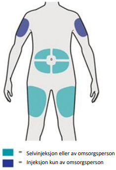 Du kan injisere i låret eller magen, bortsett fra 5 cm rundt navlen din.
