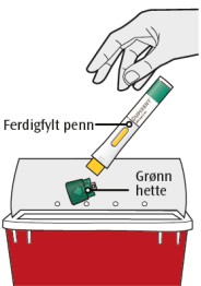 Kasser de ferdigfylte pennene (med nålen inni) og de grønne nålehettene i en punkteringssikker beholder rett etter bruk.
