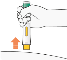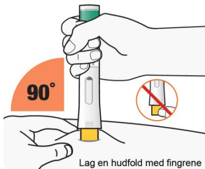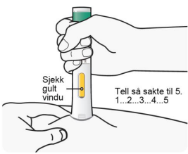 Trykk den ferdigfylte pennen bestemt mot huden til du ikke ser den gule nålebeskyttelsen, og hold den fast slik.