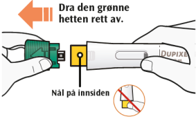 Ikke fjern den grønne hetten før like før du skal sette injeksjonen.