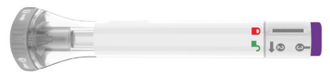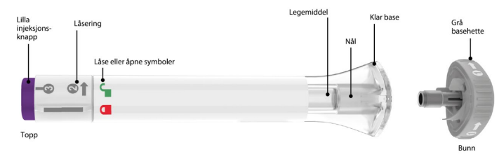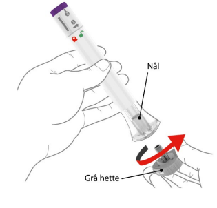 Når du er klar til å injisere, vri av den grå hetten og kast den i husholdningsavfallet.