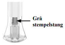 Du vet at injeksjonen er fullført når den grå stempelstangen er synlig. Fjern deretter den ferdigfylte pennen fra injeksjonsstedet.