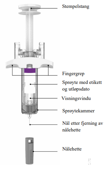 Ikke fjern nålehetten før rett før du er klar til å sette injeksjonen.