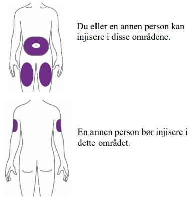 Du kan injisere i lår- eller mageområdet (abdomen), bortsett fra 5 cm (2 tommer) rundt navlen.