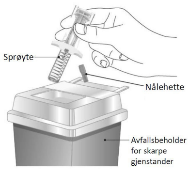 Når avfallsbeholderen for skarpe gjenstander nesten er full, skal du følge retningslinjer for riktig måte å kaste avfallsbeholdere for skarpe gjenstander på. Det kan være lokale retningslinjer for kasting av brukte nåler og sprøyter.