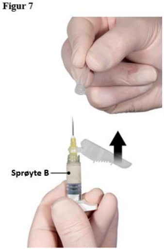 Press ut store luftbobler fra sprøyte B før administrering. Administrer produktet subkutant mens sikkerhetshetten holdes borte fra kanylen.