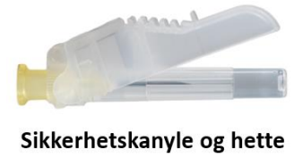 Etter låsing av sikkerhetshetten kastes kanyle og sprøyte umiddelbart i godkjent beholder.