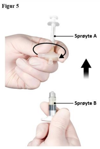 Etter blanding, hold sprøytene vertikalt med sprøyte B nederst. Sprøytene skal fortsatt være godt koplet sammen. Trekk hele innholdet inn i sprøyte B (den korte, brede sprøyten) ved å trykke inn stempelet i sprøyte A og trekke lett i stempelet i sprøyte B (figur 4).