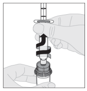 Merk: Dersom oppløsningen ikke skal brukes med én gang, kan sprøytehetten settes forsiktig tilbake på sprøytetuppen. Ikke berør sprøytetuppen eller innsiden av hetten.