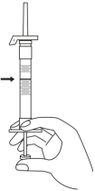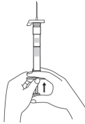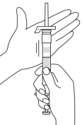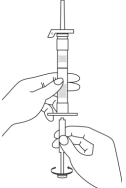 1. For å klargjøre for injeksjon holdes sprøyten rett opp (kanylen opp). Skru fast stempelet på sprøytens bunn til den bakerste gummiproppen begynner å snurre.